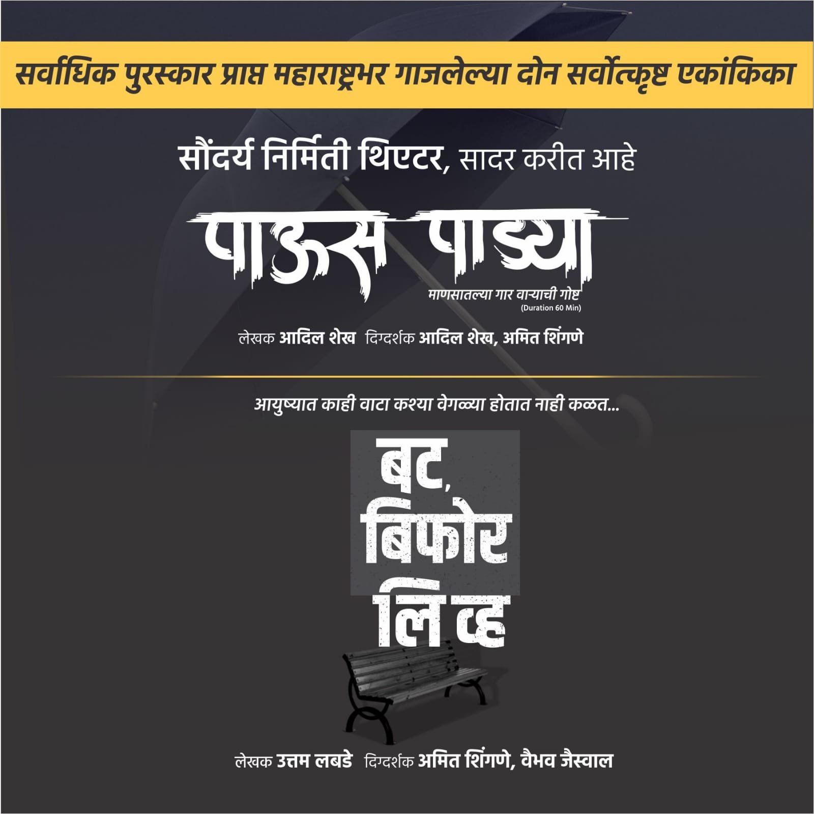 ह्या आशय पूर्ण एकांकिकेतील आदिल शेख लिखित आणि आदिल शेख-अमित शिंगणे दिग्दर्शित पाऊसपाड्या तर उत्तम लबडे लिखित आणि अमित शिंगणे- वैभव जैस्वाल दिग्दर्शित बट बिफोर लिव्ह एकांकिका आहे.याशिवाय या एकांकिकांमध्ये तांत्रिक बाजू सांभाळणारे आणि अभिनय करणारे हे नाशिकचे स्थानिक कलाकार आहेत.