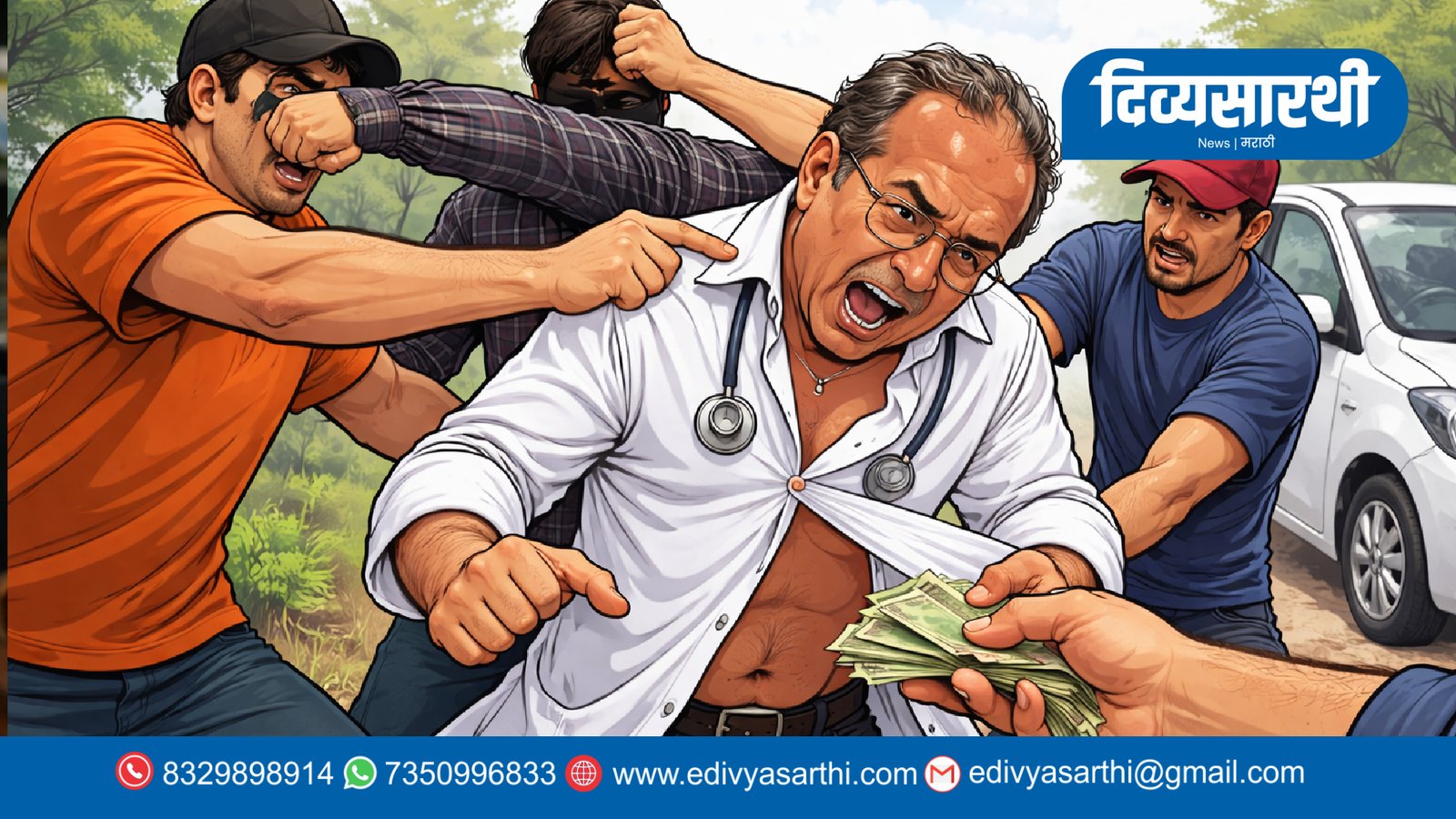 यानंतर कारमधून उतरलेल्या केतन दिलीप गोतरणे आणि त्याच्या चार साथीदारांनी “आमच्याविरुद्ध न्यायालयात दाखल केलेला खटला मागे का घेत नाहीस?” असे म्हणत डॉक्टरांना शिवीगाळ केली. त्यानंतर आरोपींनी डॉक्टरांच्या शर्टची कॉलर पकडून त्यांना दुचाकीवरून खाली ओढले आणि लाथाबुक्क्यांसह चपलेने बेदम मारहाण केली. मारहाणी दरम्यान डॉक्टरांचा शर्ट फाडून त्यांच्या खिशातील १५ हजार रुपयांची रोकड जबरदस्तीने काढून घेतली. तसेच त्यांना ठार मारण्याची धमकीही दिली.